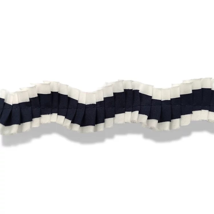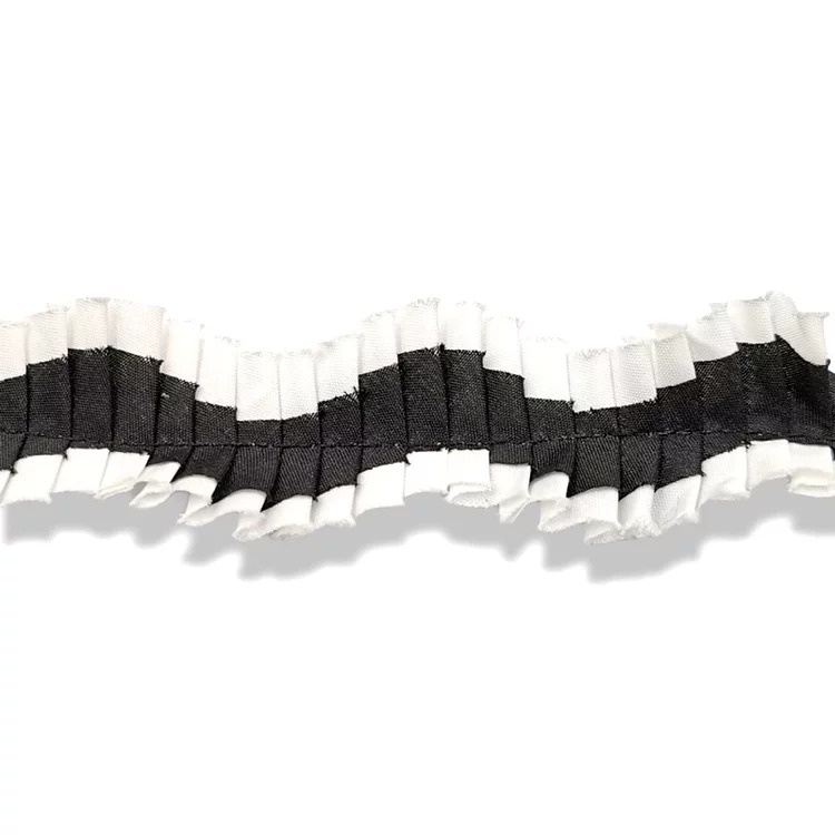 passamaneria realizzata con tessuto centrale colorato e sovrapposto a tessuto bianco, con effetto plissettato e volant mm 30