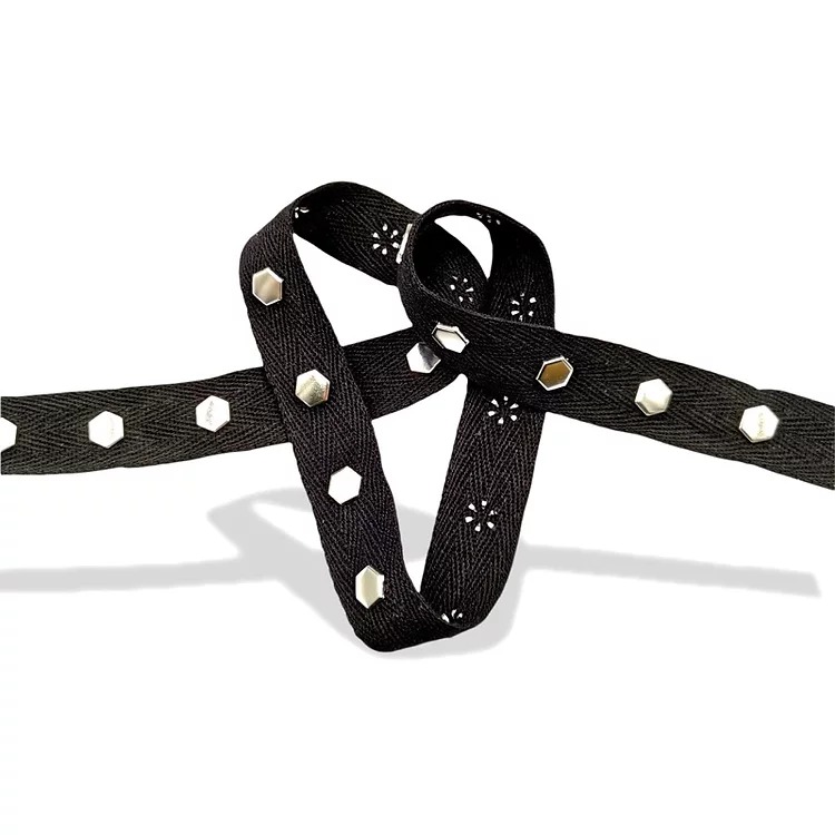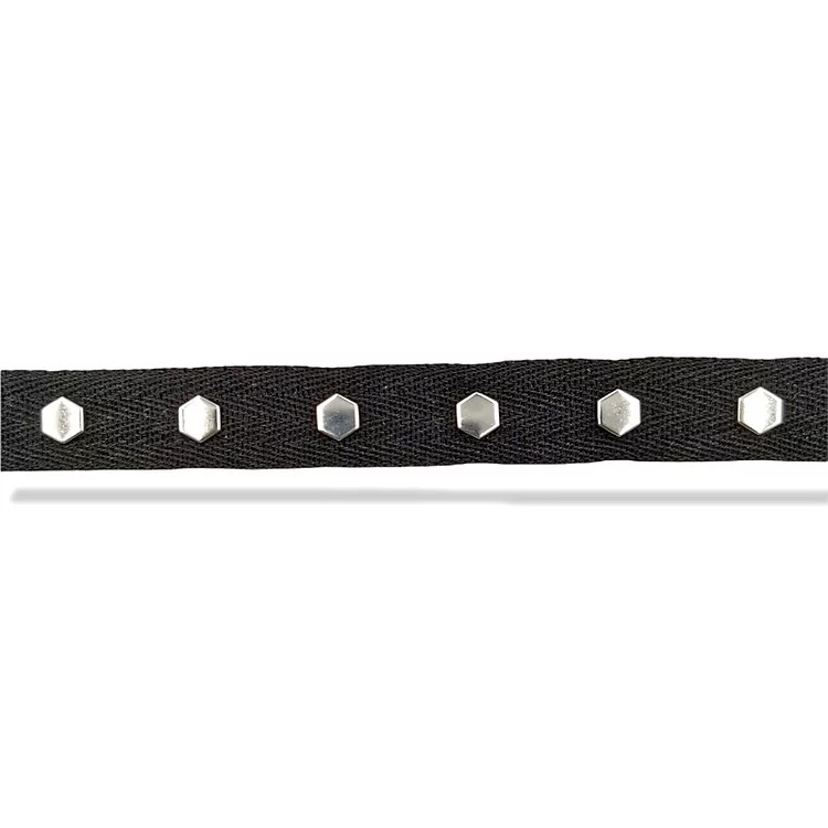 passamaneria realizzata con tessuto spigato e con borchie a rivetto esagonali, disposte centralmente ogni 18 mm h: 20 mm