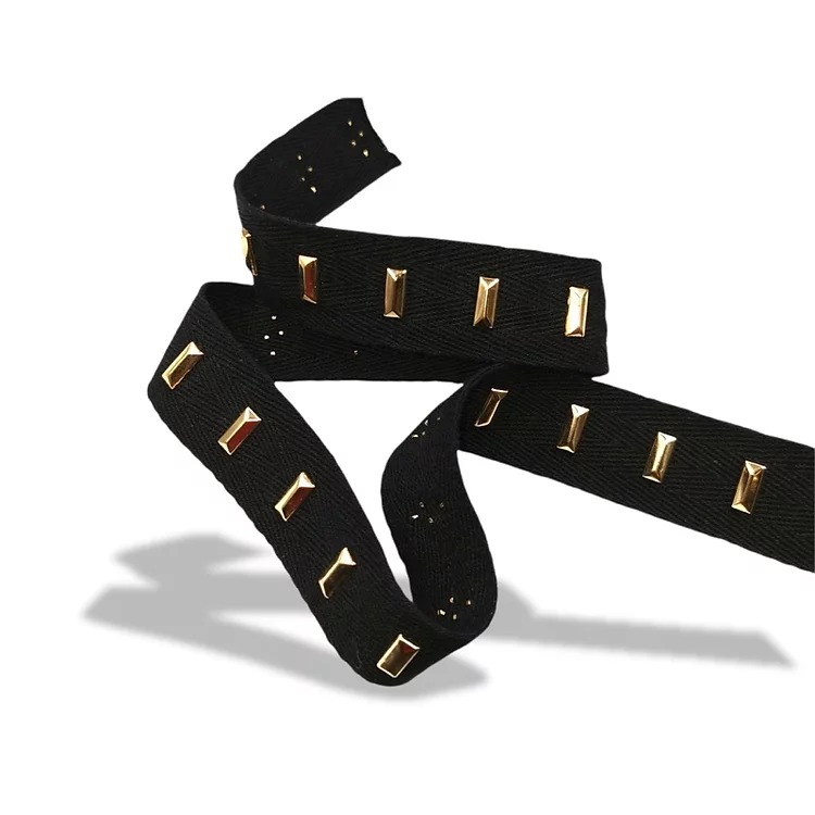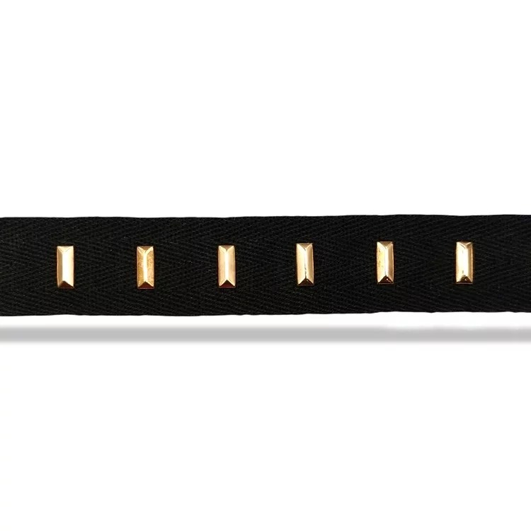 passamaneria realizzata con tessuto spigato e con borchie rettangolari e dorate a rivetto, disposte centralmente ogni 15 mm mm 2