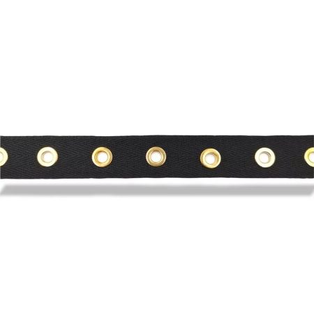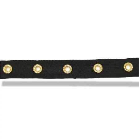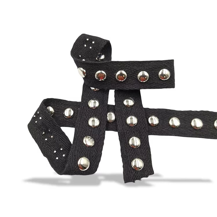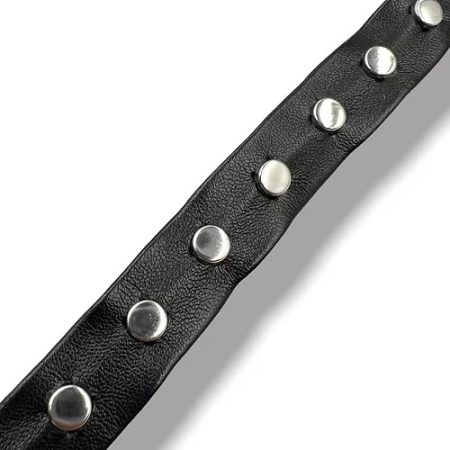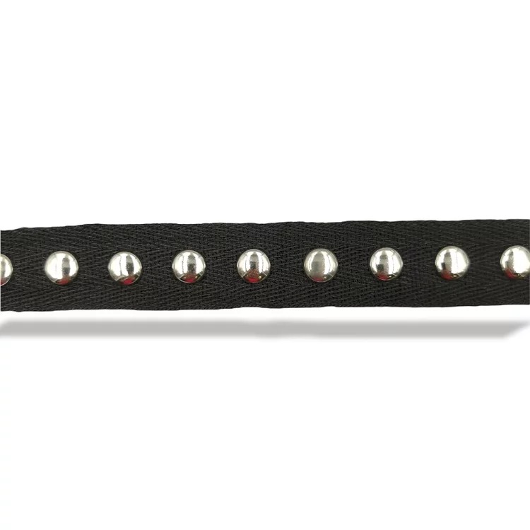 passamaneria realizzata con tessuto spigato e con borchie tonde a rivetto, disposte centralmente ogni 7 mm mm 20