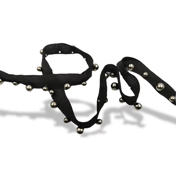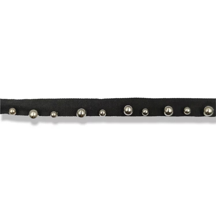 passamaneria realizzata con una bandina in gros-grain nero e perle di color grigio canna di fucile, applicate all’interno mm 15