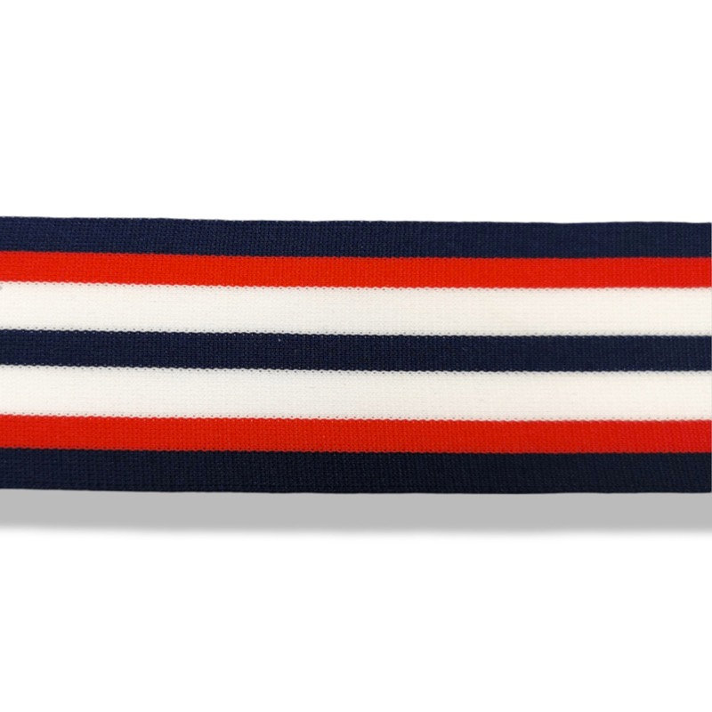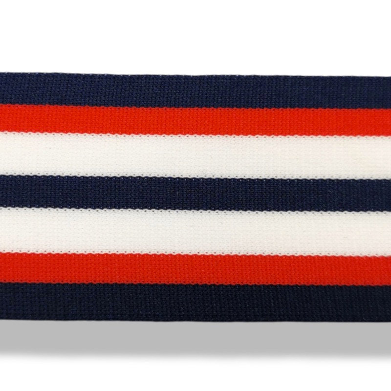 passamaneria realizzata in gros grain a linee orizzontali, con linea centrale blue e laterali bianche, rosse e blue mm 40