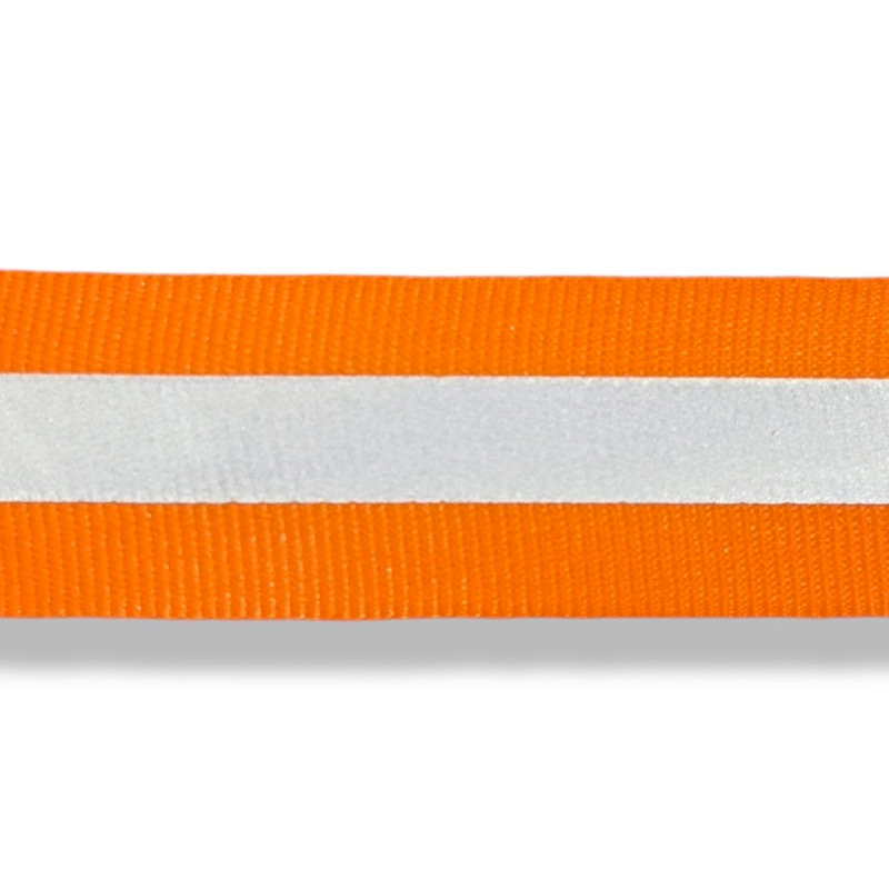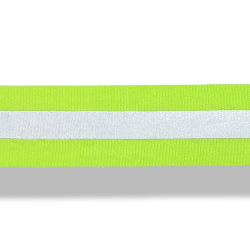 passamaneria realizzata in gros grain, composta da tre linee orizzontali, la linea centrale È catarifrangente mm 25