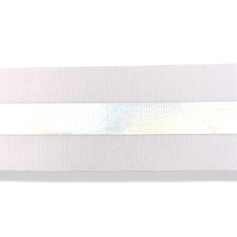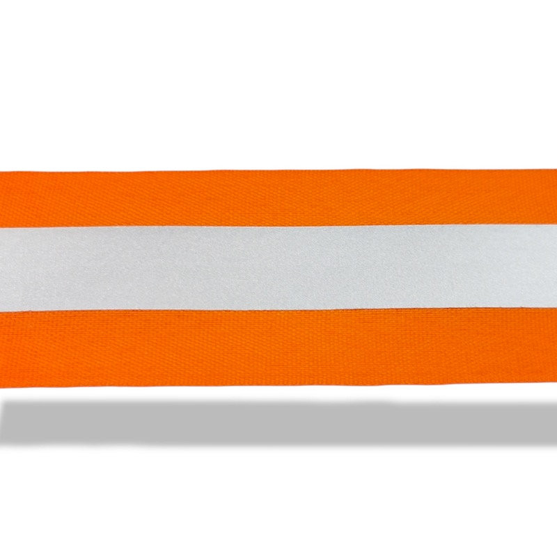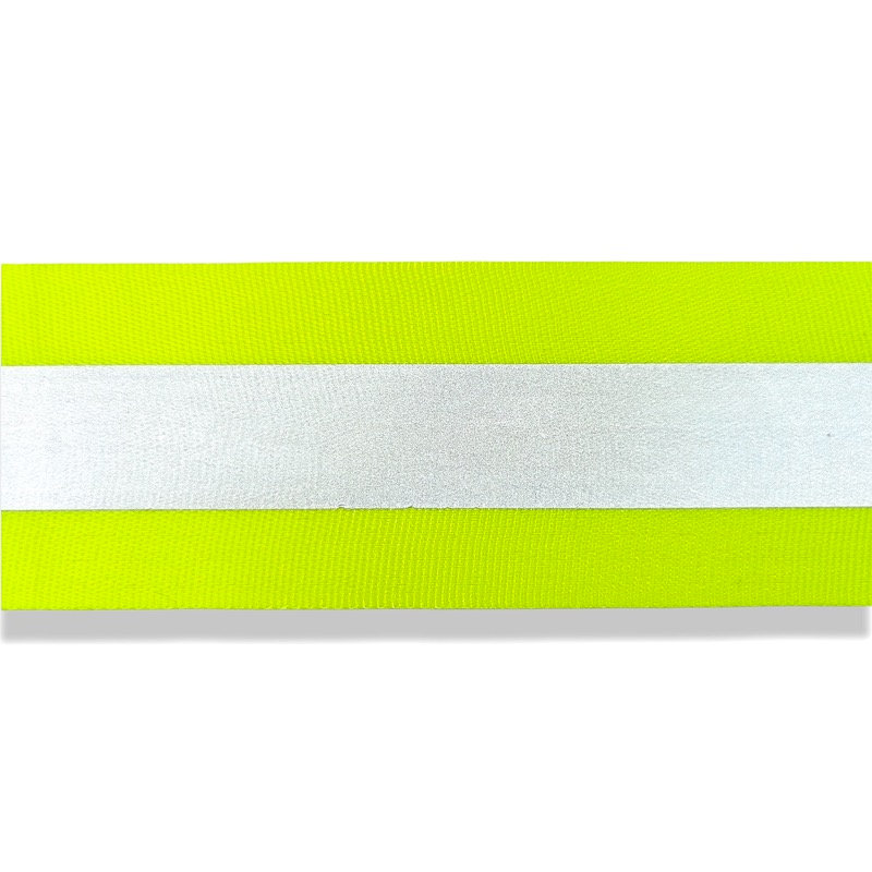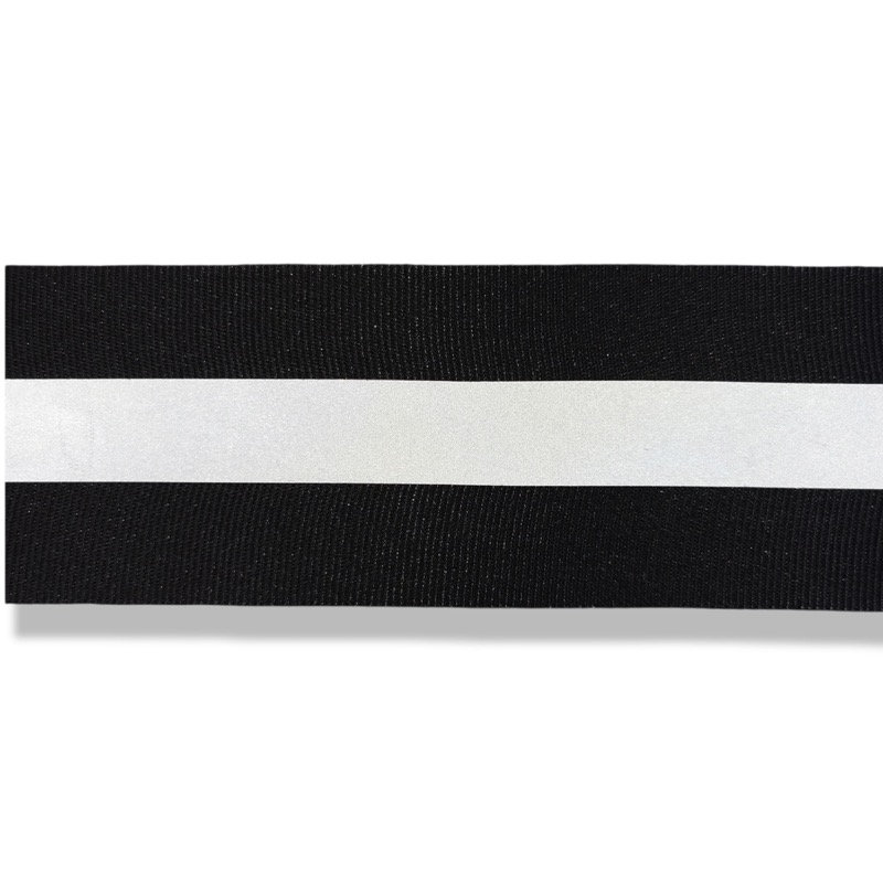 passamaneria realizzata in gros grain, composta da tre linee orizzontali, la linea centrale È catarifrangente mm 50
