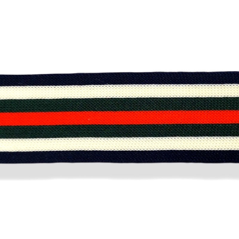 passamaneria realizzata in maglina a linee orizzontali, con linea centrale rossa e laterali verdi, bianche e blue mm 25