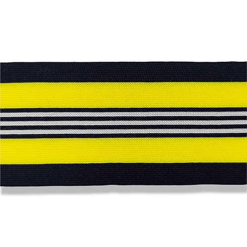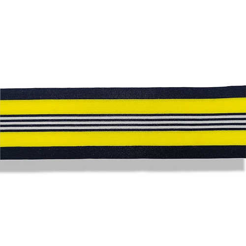 passamaneria realizzata in maglina a linee orizzontali, con righini centrali blue e bianchi, e fasce laterali gialle e blue mm 4