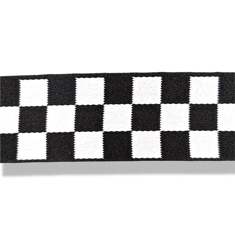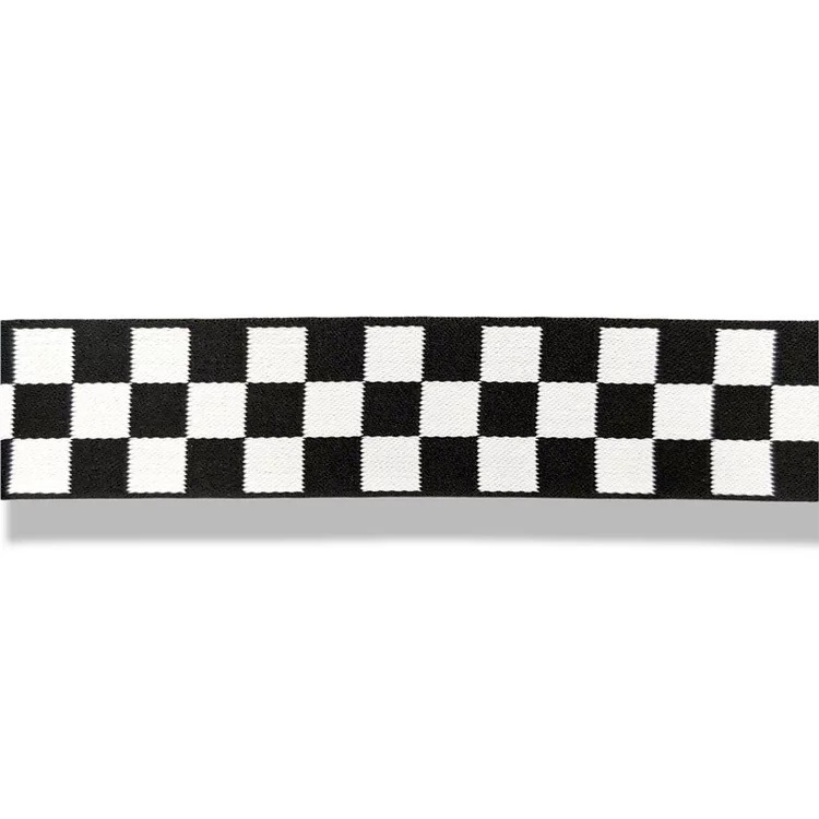 passamaneria realizzata in maglina a tema scacchi, con due serie di caselle nere e bianche mm 25