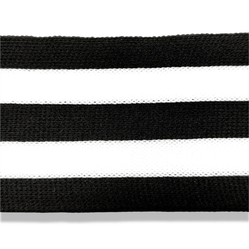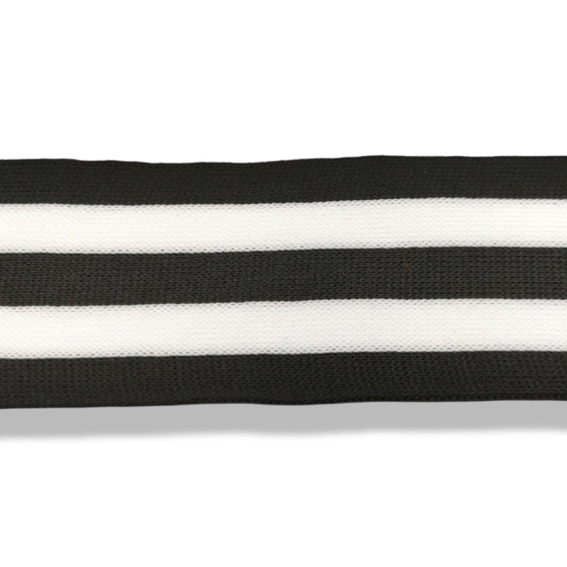 passamaneria realizzata in maglina, composta da linee orizzontali, linea centrale nera, linee bianche laterali e bordi neri mm 5