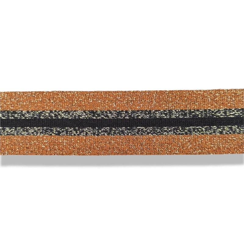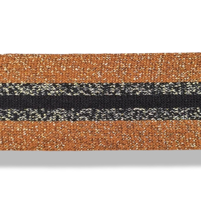 passamaneria realizzata in maglina con fili glitterati e una linea centrale nera, su fondo marroncino mm 40