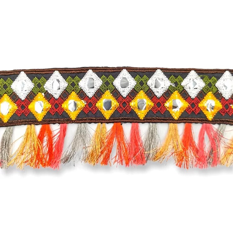 passamaneria realizzata in stile etnico, la bandina È ricamata e contenente inserti lucidi, con conseguenti pendenti a forma di