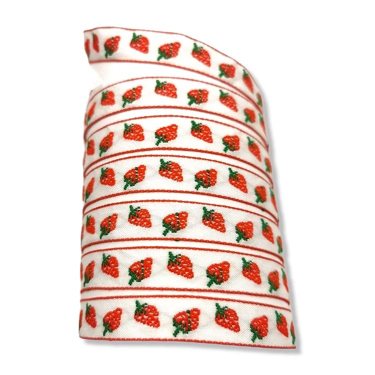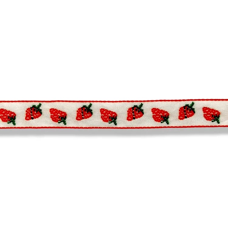 passamaneria realizzata su fondo bianco con ricami raffiguranti delle fragole mm 15