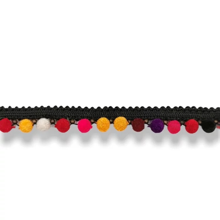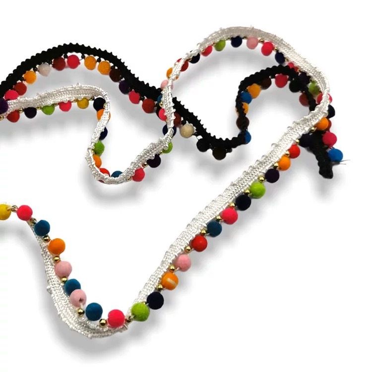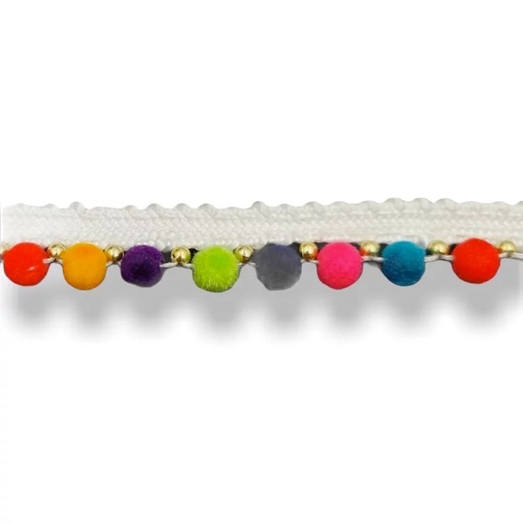 passamaneria ricamata a macchina ed applicati pompon colorati, intervallati ogni centrimetro h: 18 mm , di cui la bandina 10 mm