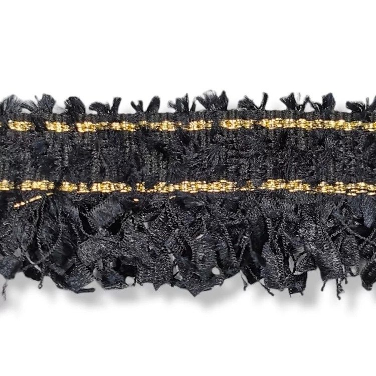 passamaneria sfrangiata realizzata con bandina superiore ed inserti in filo lurex oro mm 35