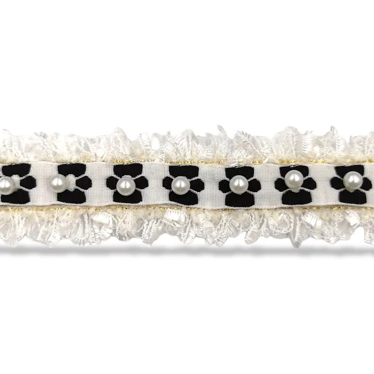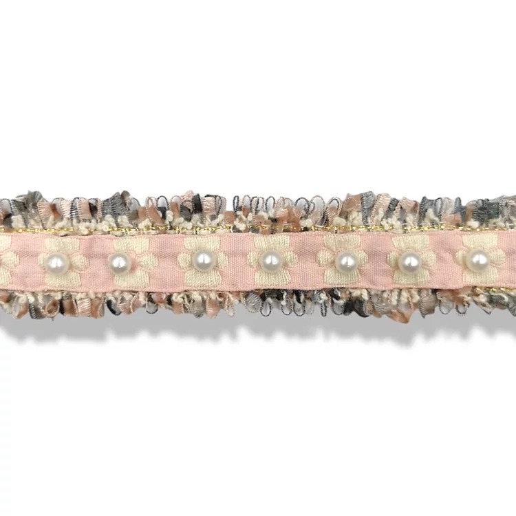 passamaneria sfrangiata, realizzata da una bandina centrale con disegni floreali e perle applicate al suo interno mm 40