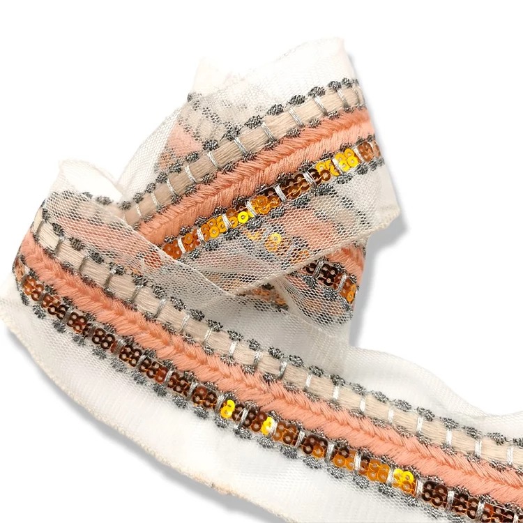 Recensisci per primo “passamaneria su base di tessuto in tulle, realizzata con ricami centrali in filo e paillettes mm 50”