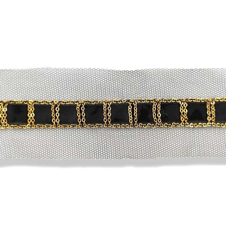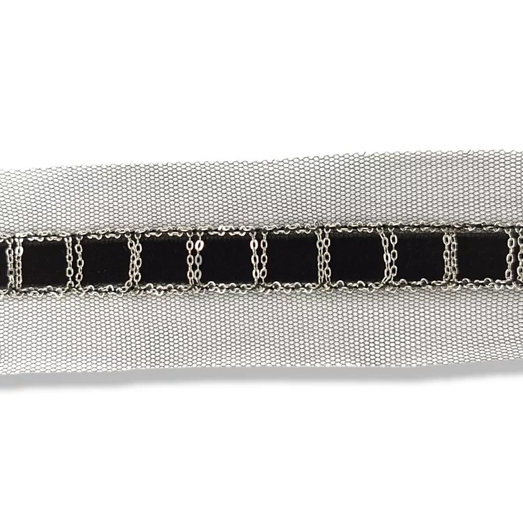passamaneria su base di tulle bianco, realizzata con una catenella metallica disposta a quadrati su una bandina in velluto mm 45