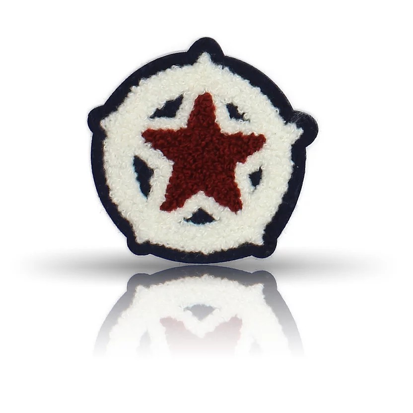 patch di forma circolare, ricamata e termoadesiva, in punta spugna , raffigurante in rilievo una stella a cinque punte 7,2 cm x