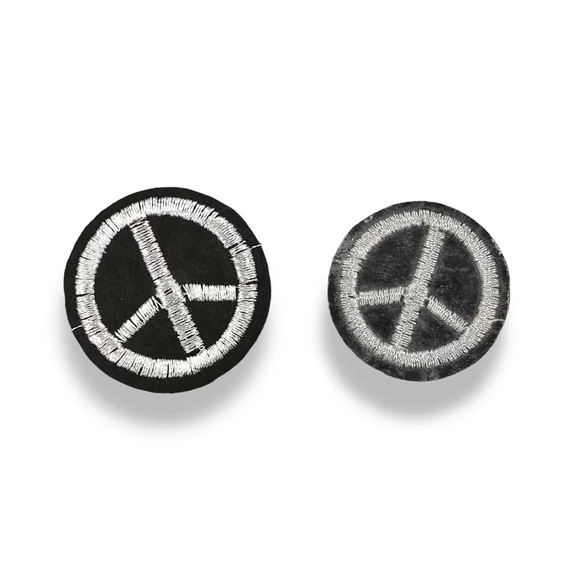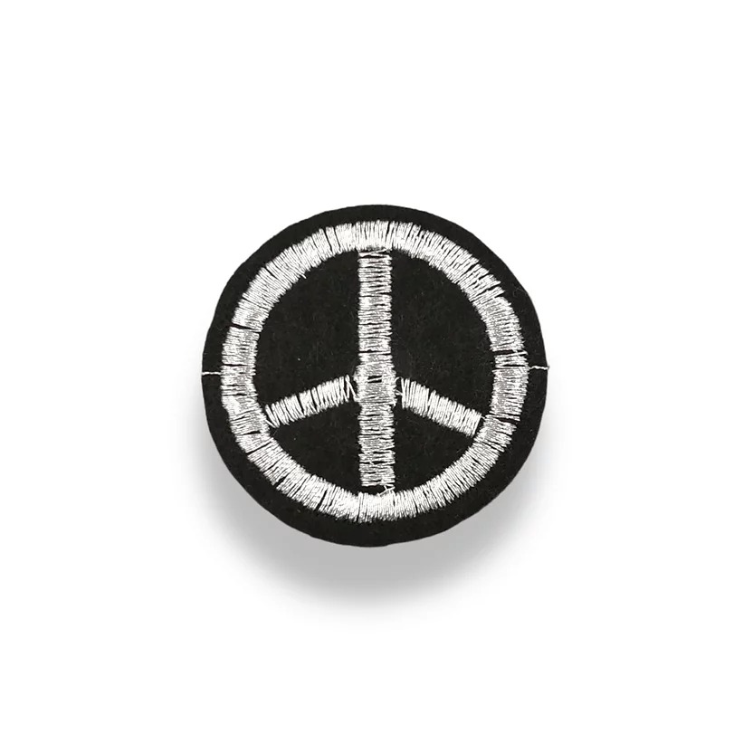 patch di forma circolare, ricamata e termoadesiva, raffigurante in rilievo con colore silver il simbolo della pace 3,5 cm x 3,5