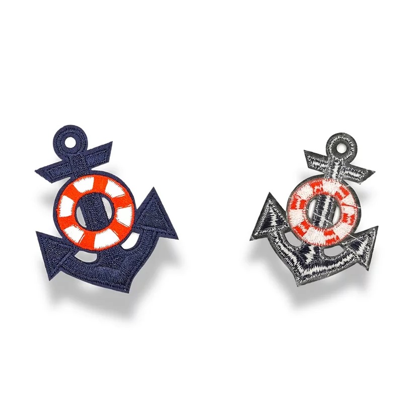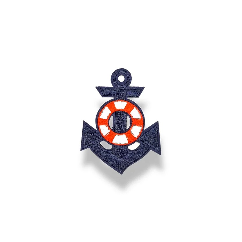 patch ricamata e termosaldata a forma di ancora di colore blue, con inserto a forma di salvagente bianco e rosso 6,7 cm x 9,7 cm
