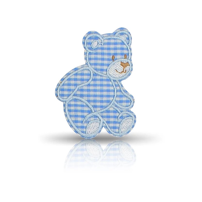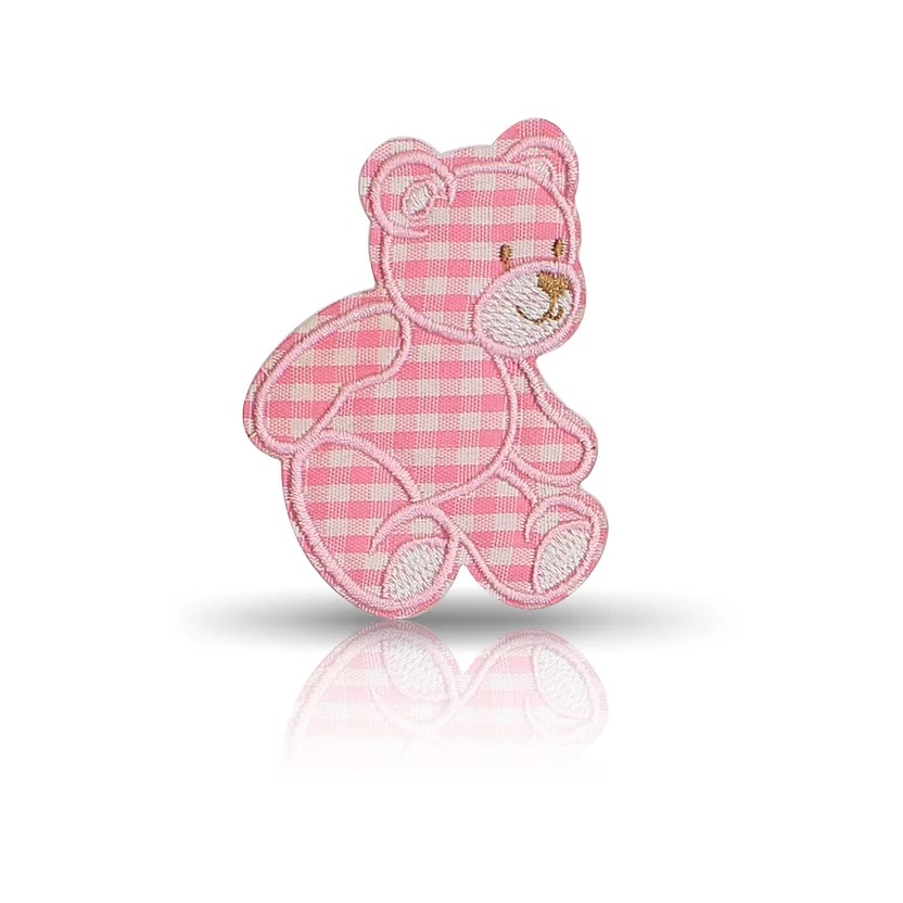 Recensisci per primo “patch ricamata e termosaldata a forma di orsetto, con fondo a fantasia quadrettata rosa e bianco e lineamenti ricamati a contras”