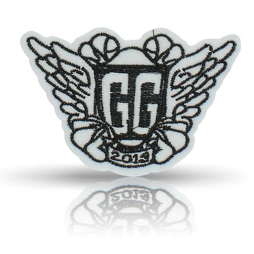 patch ricamata e termosaldata di colore nero su fondo bianco, raffigurante due ali aperte contenente lettere e numeri 9 cm x 6,2