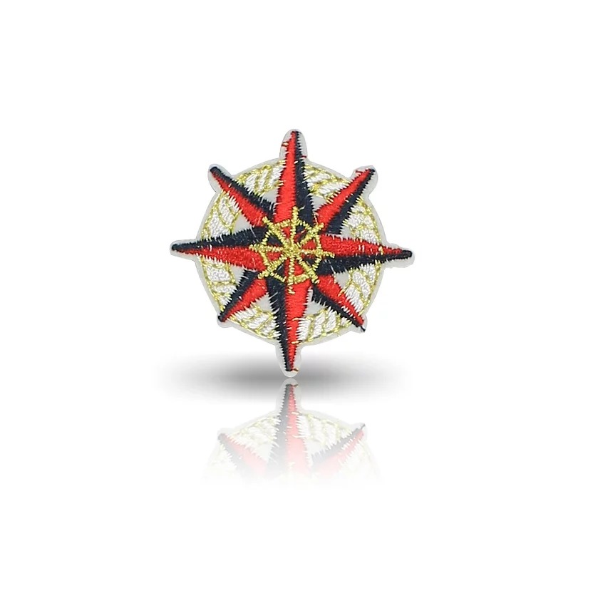 patch ricamata e termosaldata raffigurante la rosa dei venti, di colore rosso e blu e timone a contrasto di colore dorato 4 cm x