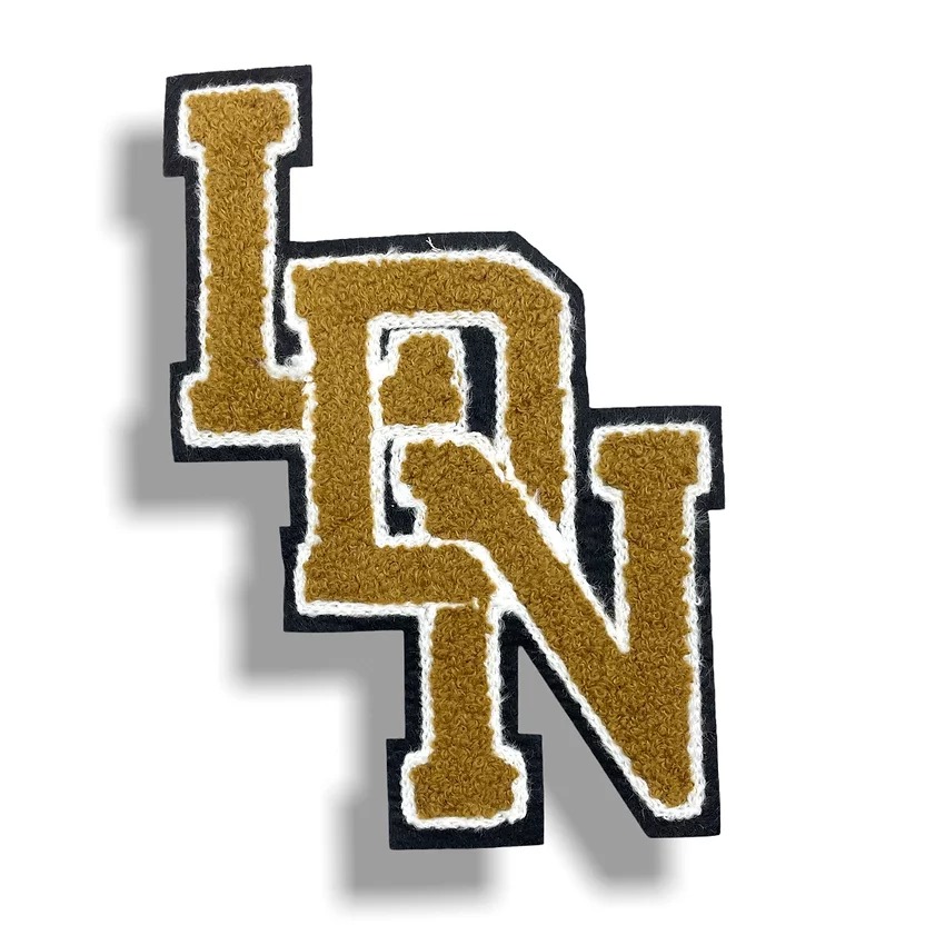 patch termoadesiva base in panno lenci raffigurante la scritta ”ldn”, ricamata interamente a macchina in punto spugna 17 cm x