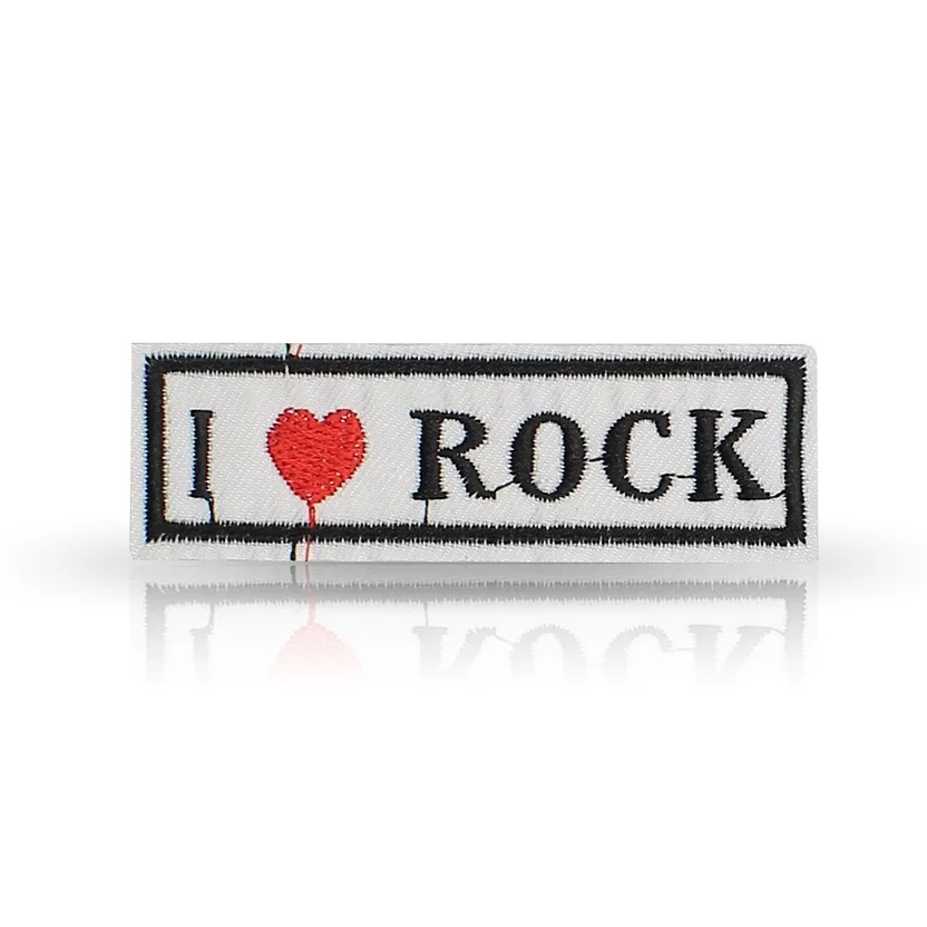 patch termoadesiva di forma rettangolare e ricamata interamente a macchina, tessuto di fondo bianco e scritte nere e rosse a ril