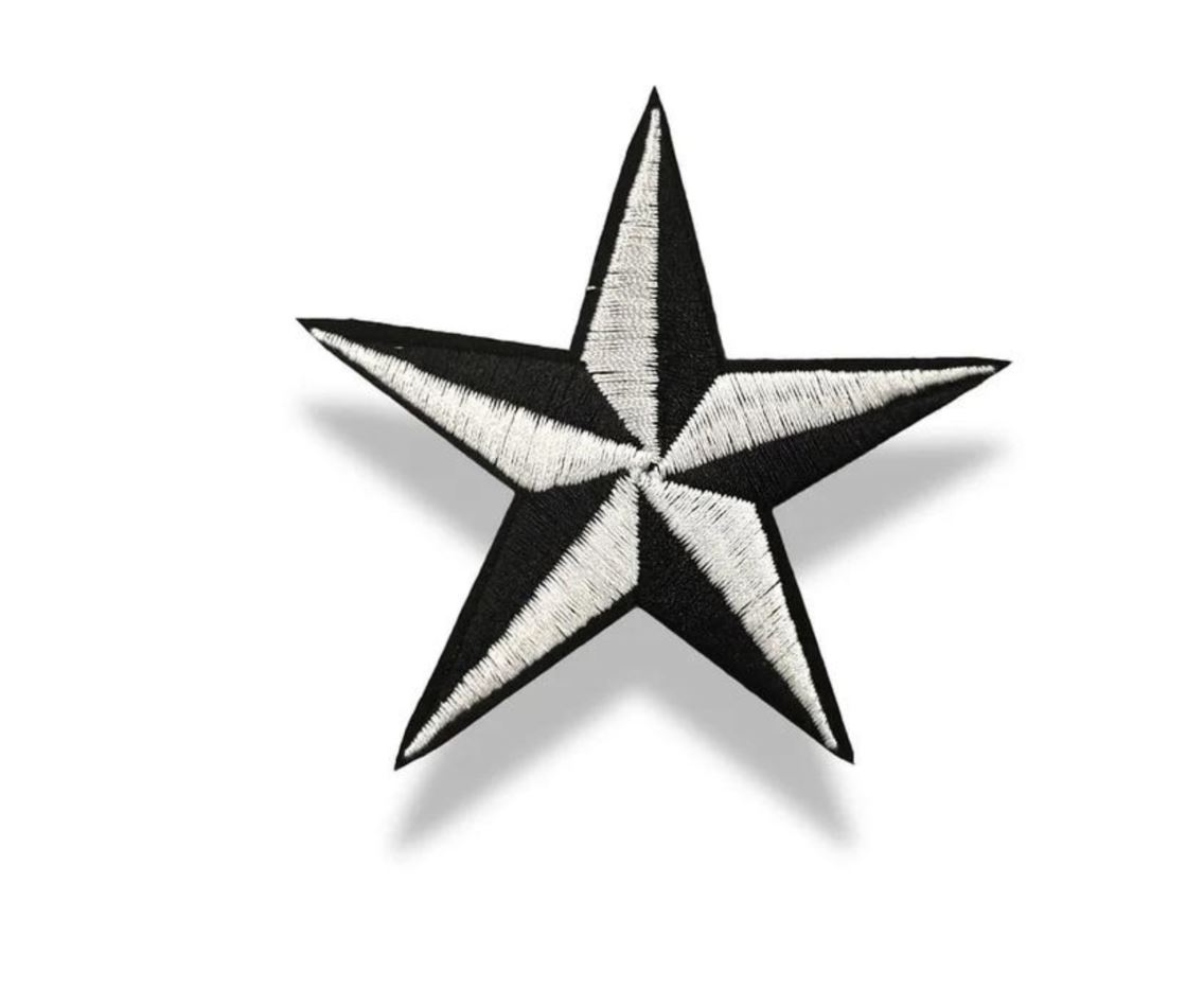 patch termoadesiva e interamente ricamata a macchina, raffigurante una stella a cinque punte con lati sfaccettati di colore nero