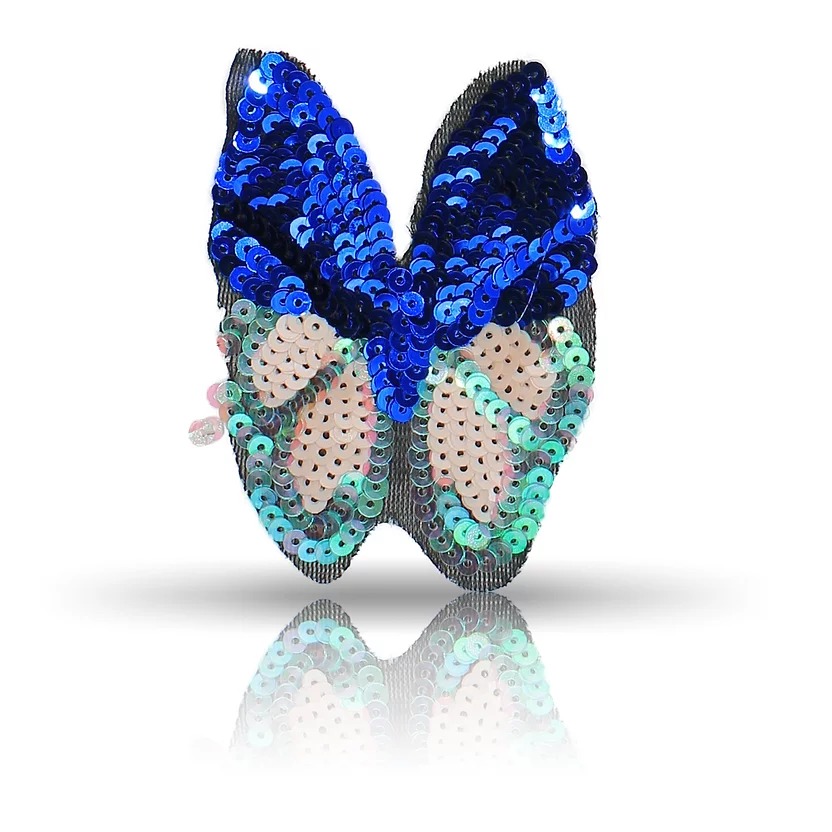 patch termoadesiva e realizzata interamente con paillettes, raffigurante una farfalla con ali aperte in colori vivaci 7 cm x 9,6
