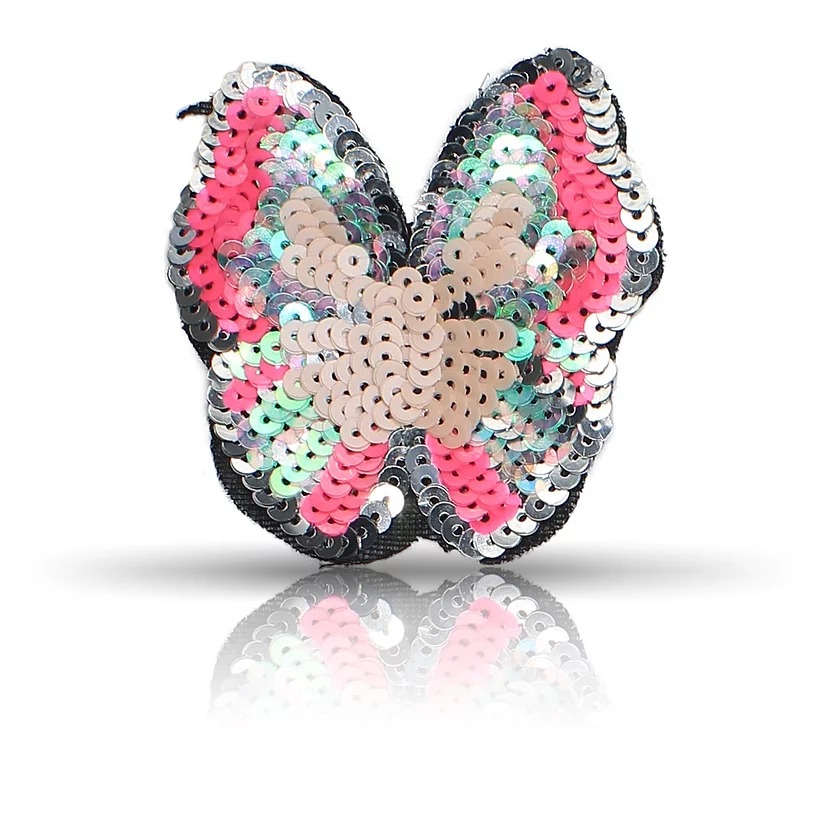 patch termoadesiva e realizzata interamente con paillettes, raffigurante una farfalla con ali aperte in colori vivaci 7,5 cm x 8