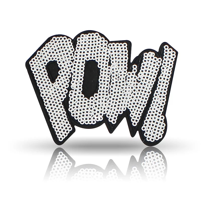 patch termoadesiva e ricamata interamente a macchina con paillettes di colore argento su fondo nero 10 cm x 7,3 cm