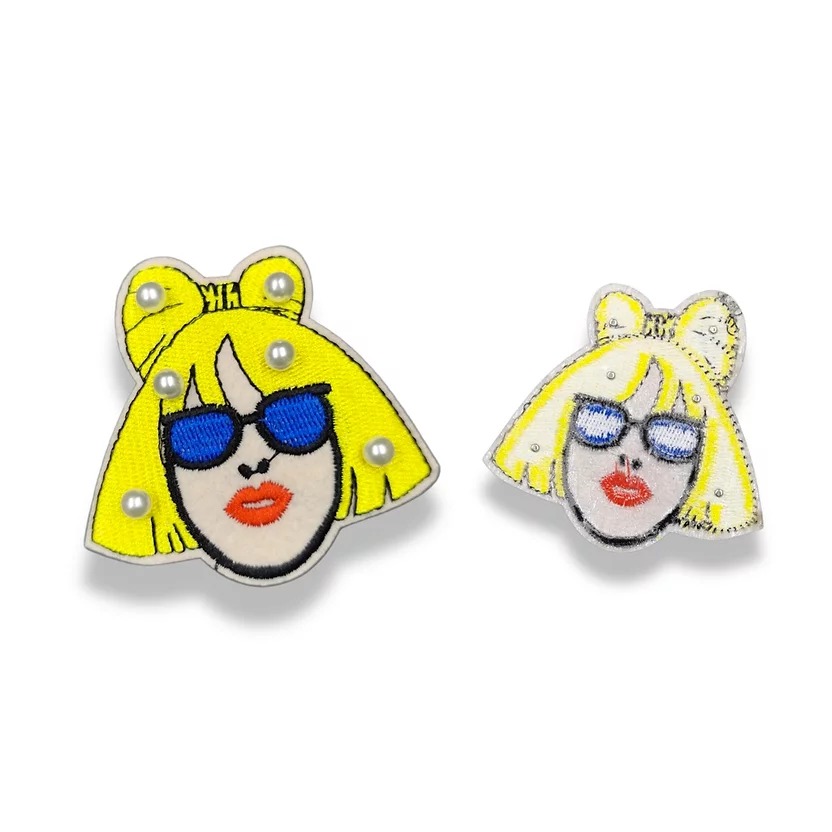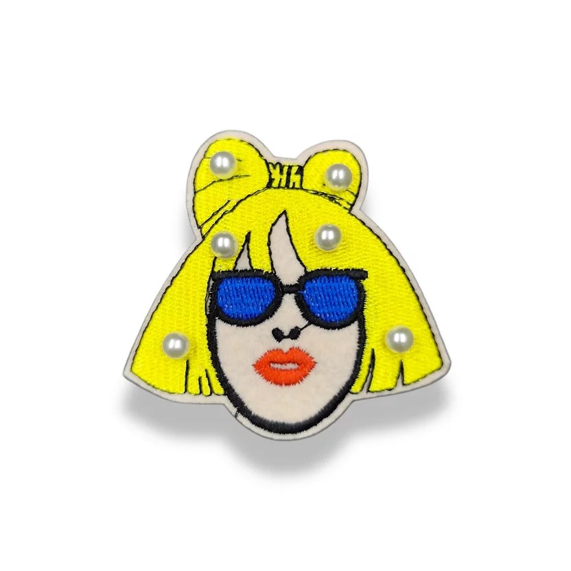 patch termoadesiva e ricamata interamente a macchina e con perline applicate, raffigurante il volto di una ragazza con occhiali