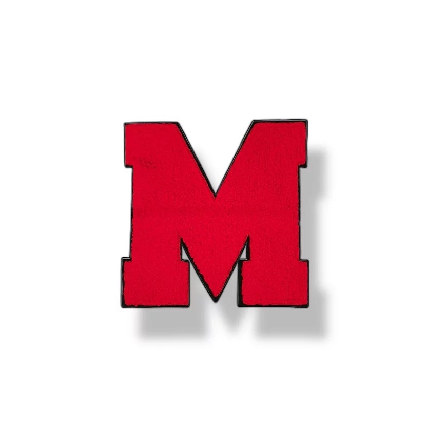 patchgrande termoadesiva e ricamata in punto spugna di colore rosso raffigurante la lettera maiuscola ” m ” su fondo nero 15 cm