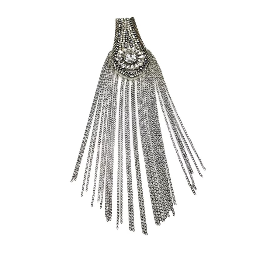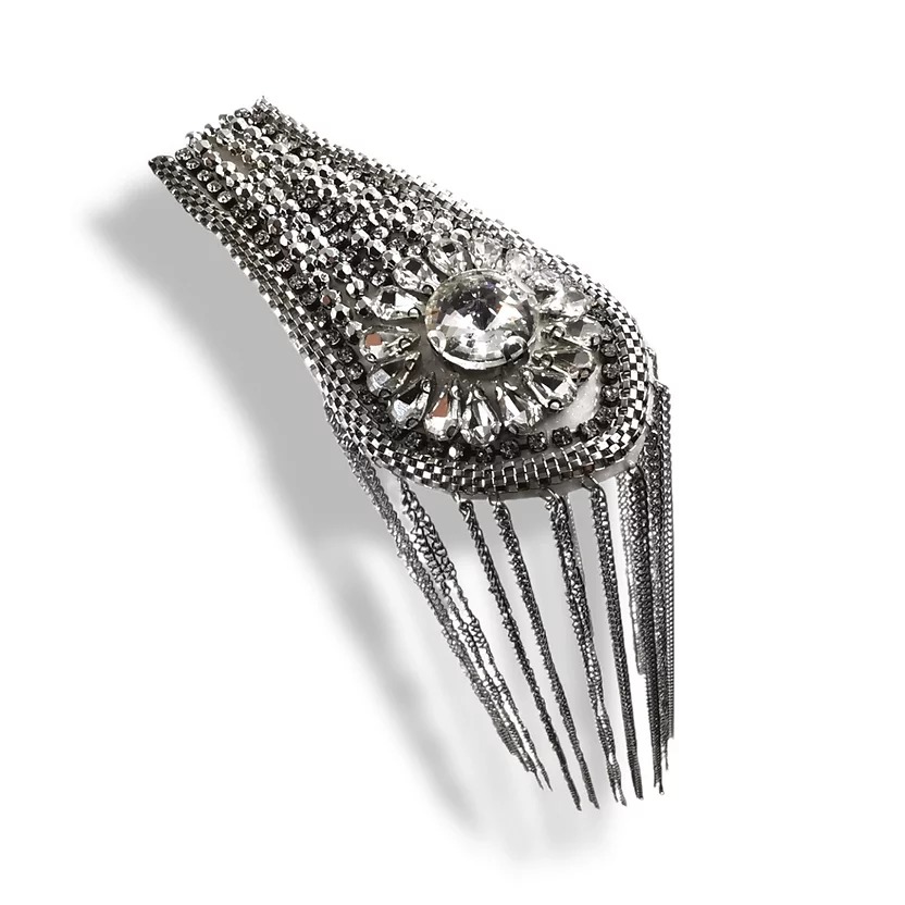 spallina realizzata con pietre crystal, file di strass e maglie metalliche. i pendenti sono formati da catenelle in metallo 10,5