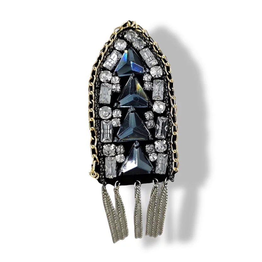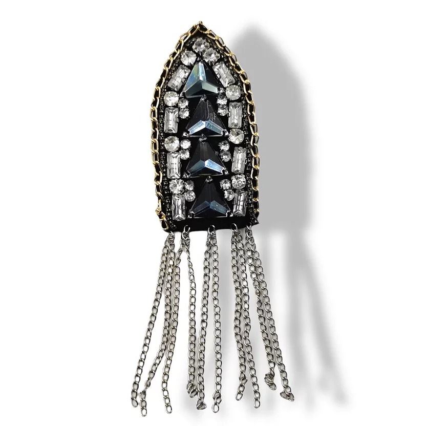 spallina realizzata con pietre, una fila di strass e da una catenelle dorata,i pendenti sono formati da catenelle in allluminio