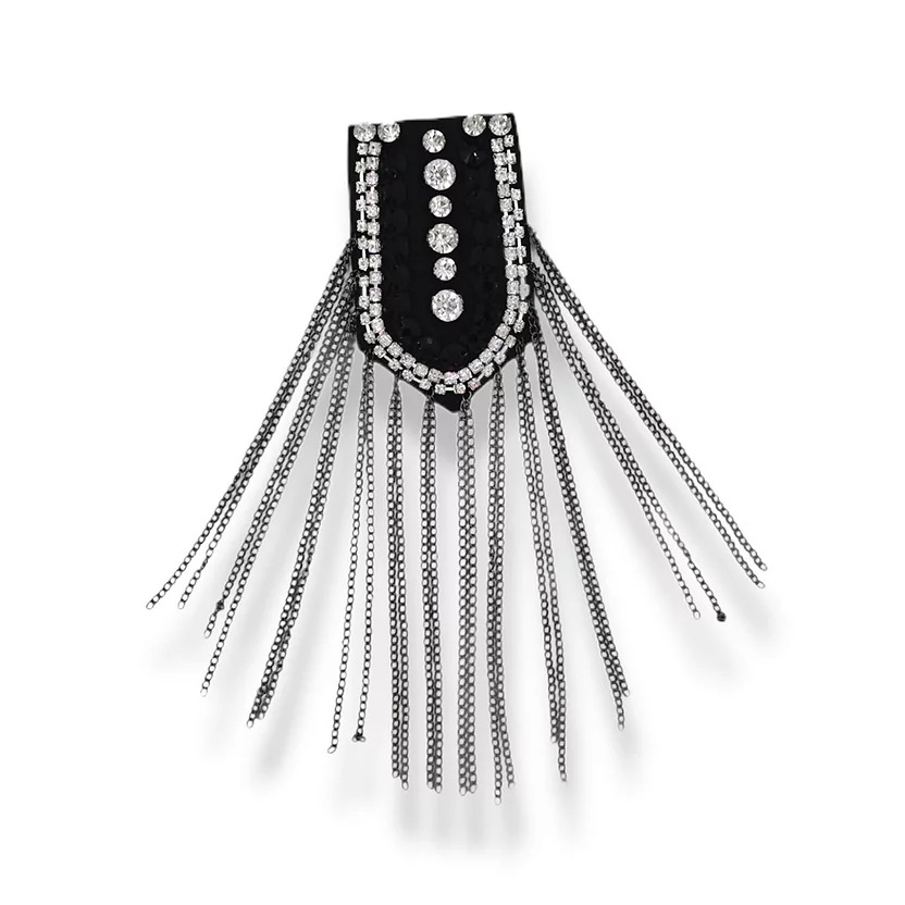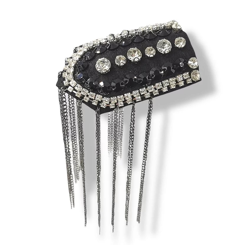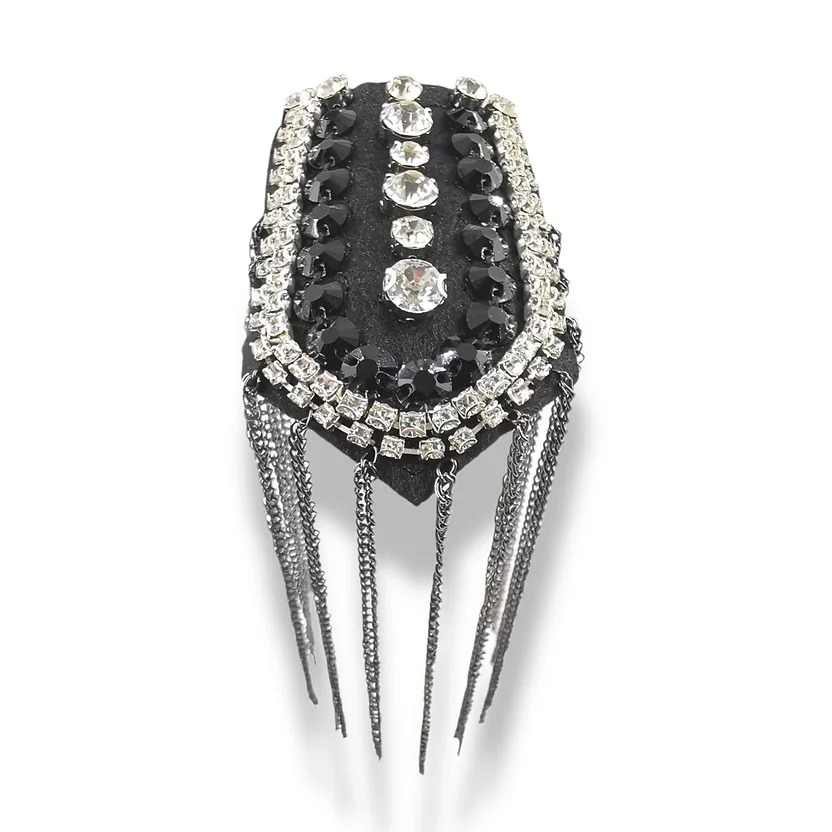 spallina realizzata su base nera con pietre e piaillettes nere ricamate, con file di strass e pietre crystal. i pendenti sono fo